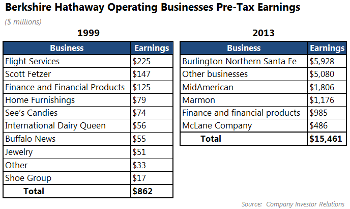 And to put this change into even more clarity, consider the radically different picture of the breakout of earnings from the operating businesses which made up Berkshire in 1999 versus 2013: