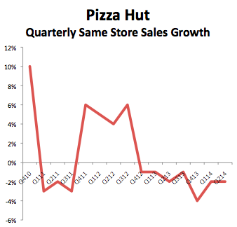 Pizza sales are cooling off for Pizza Hut. Data source: Yum! Brands quarterly SEC filings.