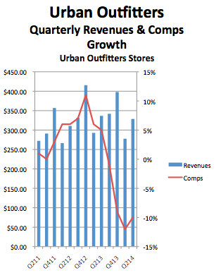Last quarter, Free People enjoyed its ninth straight quarter of double-digit comps growth -- eight straight have seen a 20% or better rise -- and Anthropologie has had a similar positive showing, even if growth isn't of the same magnitude. But it's still so much better than UO's run, which exhibits all the signs of accelerating doom, with double-digit declines in the last two quarters.