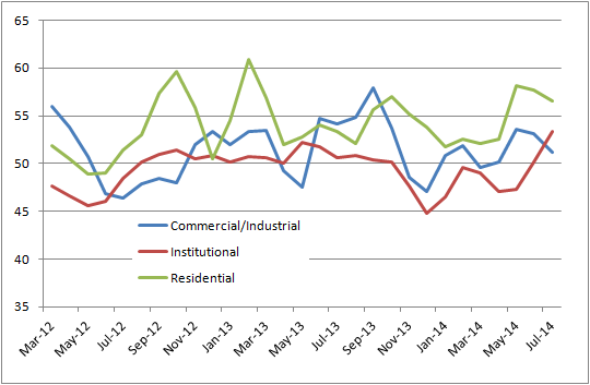 A quick look at the industry components in the Architecture Billings Index (a leading indicator of construction activity) confirms the recent pickup. A reading above 50 indicates expansion.