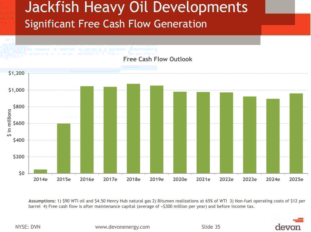 Looking ahead Devon Energy expects its focus on high-margin oil to really drive cash flow growth. In fact, starting next year the company's Jackfish complex in the Canadian oil sands will finally begin to deliver free cash flow. Over the next few years free cash flow from Jackfish is expected to surge to well over a billion dollars annually and keep up that pace for many years into the future, as the following slide points out.