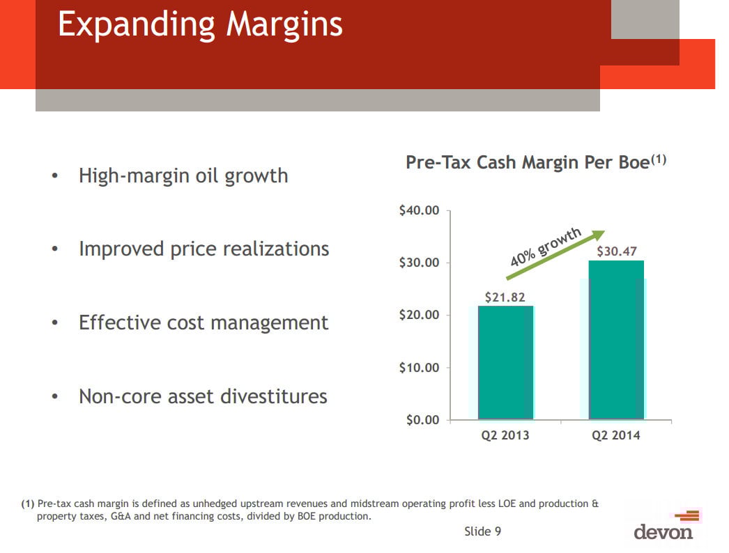 Devon Energy's strong oil position is driving meaningful growth. As this next slide points out, the company's oil focused assets are really driving growth that matters, as the company's pre-tax cash margins are surging.