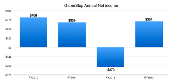 But that focus also leaves the company extremely vulnerable to industry downturns. Long-term shareholders remember that GameStop suffered through two straight years of comps declines through 2012.