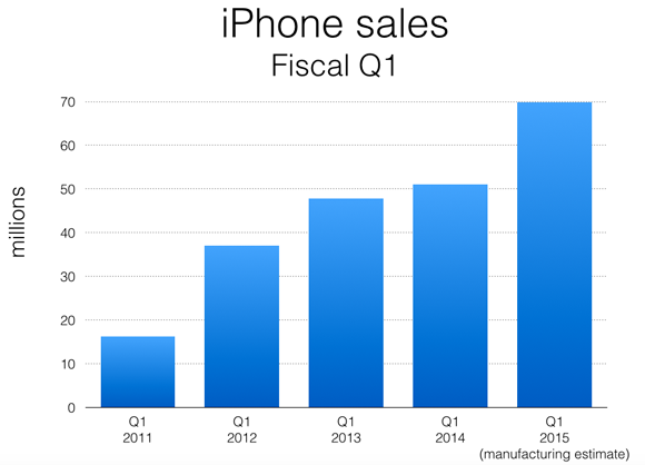 Here's Apple's fiscal Q1 (which starts in October) sales numbers over the past few years, along with manufacturing prediction for Q1 2015:
