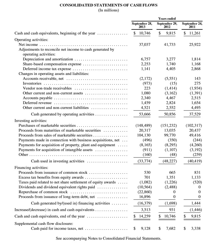 Below is a screenshot of Apple's (AAPL 0.68%) cash flow statement from its fiscal year 2013 10-K. You will notice that Apple made some of the adjustments discussed above including adding back depreciation and amortization, stock-based compensation, deferred revenue, and deferred income taxes, and making adjustments to working capital accounts (accounts receivable, inventory, and accounts payable) based on whether those account balances increased or decreased from the prior year (info you can find on Apple's balance sheet).