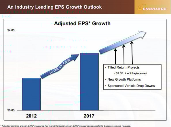 When we look at the company's current growth pipeline, it's impressive to say the least. The company currently has an enterprisewide program totaling a staggering $37 billion in commercially secured growth capital projects, with another $5 billion in unsecured projects. These projects are expected to deliver 10%-12% compound annual earnings growth through 2017, which should create a lot of value for investors.