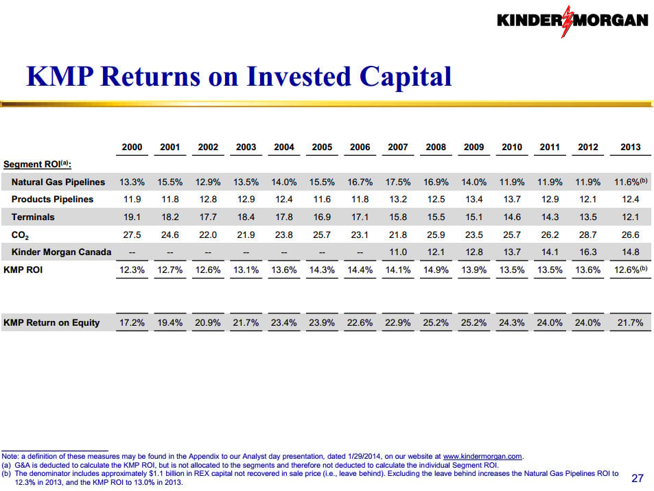 However, as impressive as Kinder Morgan's project backlog might be, that isn't what makes it the best stock to invest in for investors seeking to profit from our growing need for oil and gas pipelines. Instead, it's the returns Kinder Morgan earns on invested capital that make it a top stock. As the following slide shows, those returns have averaged well over 20% for more than a decade.