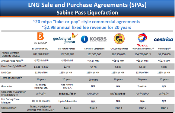 The idea of global liquefied natural gas export and trade sounds like a complex subject that the everyday investor might be afraid of tackling, but the company's business is actually very simple. Cheniere Energy and its subsidiaries -- Cheniere Energy Partners (NYSEMKT: CQP) and Cheniere Energy Partners Holdings (NYSEMKT: CQH) -- own two LNG liquefaction and export facilities. Under long-term purchasing contracts, Cheniere will sell LNG to clients based on certain volume commitments and fees both dependent and independent of the price of natural gas. This chart shows the summary of all the contracts it has signed for its Sabine Pass facility in Louisiana.