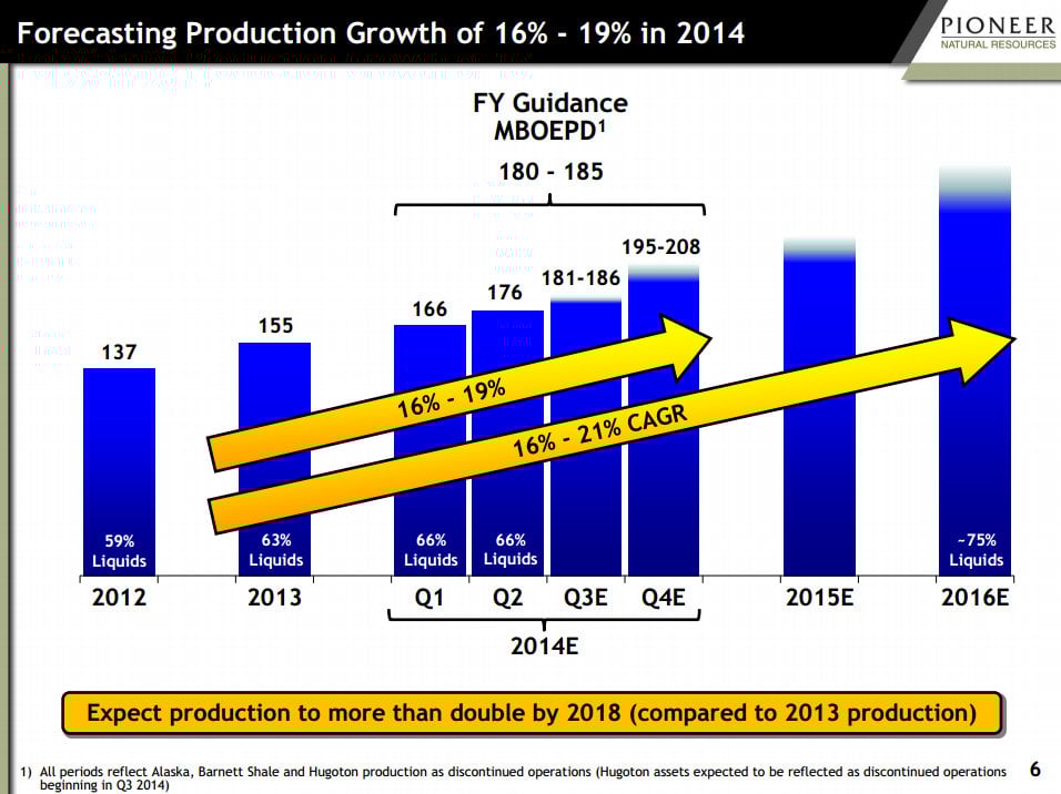 Pioneer Natural Resources plans to use its prime position in the Permian Basin to fuel 16%-21% compound annual production growth through 2016. That puts the company on pace to double its 2013 production by 2018, as noted on the following slide.