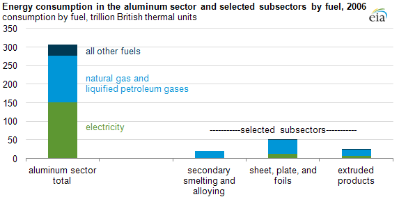 Recycled aluminum, which in the U.S. primarily comes from beverage cans and automotive parts, doesn't require as much energy because the aluminum is simply melted down in a furnace that is usually fired by natural gas. As illustrated in the chart, this segment's energy consumption is just a fraction of that of the aluminum sector as a whole.