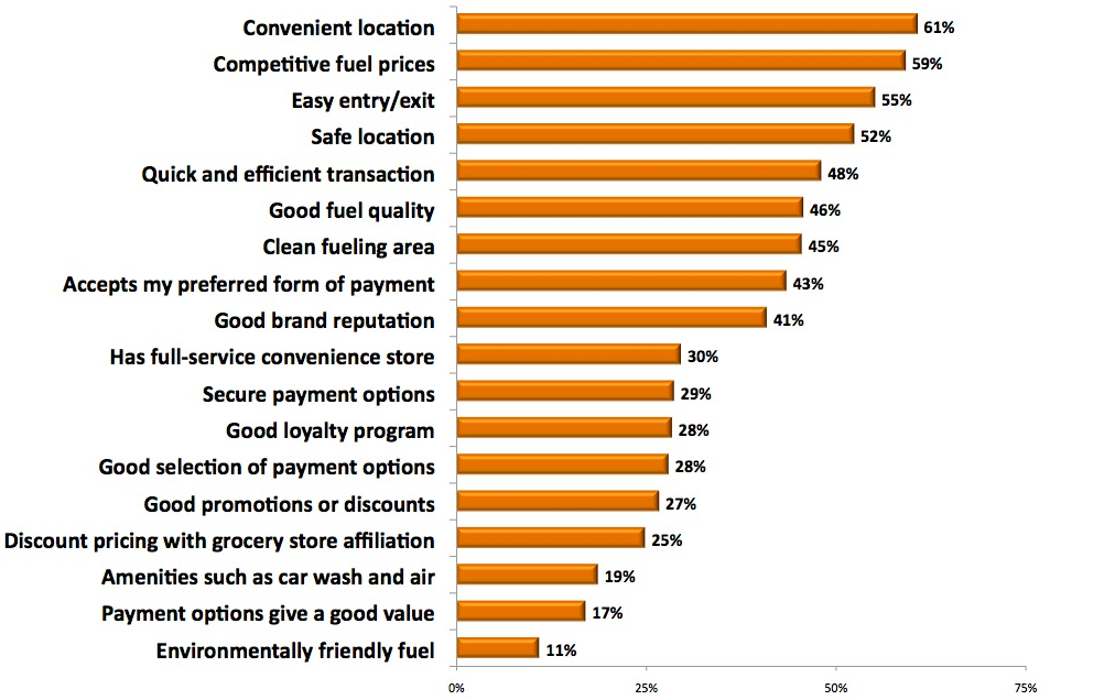 But the real differentiator for Kroger is having more convenient locations. Only about 400 of Costco's warehouses have gas stations, which is no match for Kroger's 1,300 location footprint. Fuel shoppers do travel in order to find the lowest prices, but that's not the most important factor they consider when buying gas. According to the survey, convenience is.