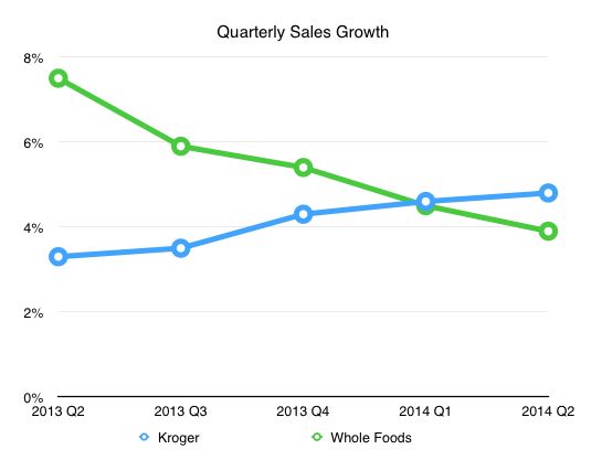A similar competitive story is playing out at Kroger right now. Thanks to contributions from its surging natural foods business and its recent acquisition of Harris Teeter, the grocer just posted its 43rd straight quarter of comparable-store sales growth. And that 5% comps gain was good enough to push Kroger ahead of Whole Foods for the first time.
