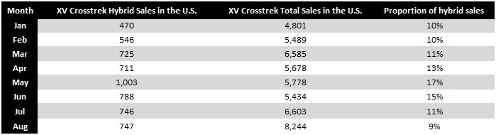 The XV Crosstrek Hybrid got a good start in America. When the hybrid was launched, management expected sales in the range of 10%-15% of total XV sales, a goal that has been met in the U.S. Though the ratio dropped to 9% in August, as shown in the table below, it was due to the excellent growth of the conventional model, which the hybrid couldn't keep pace with. There was no sales drop for the hybrid as such.