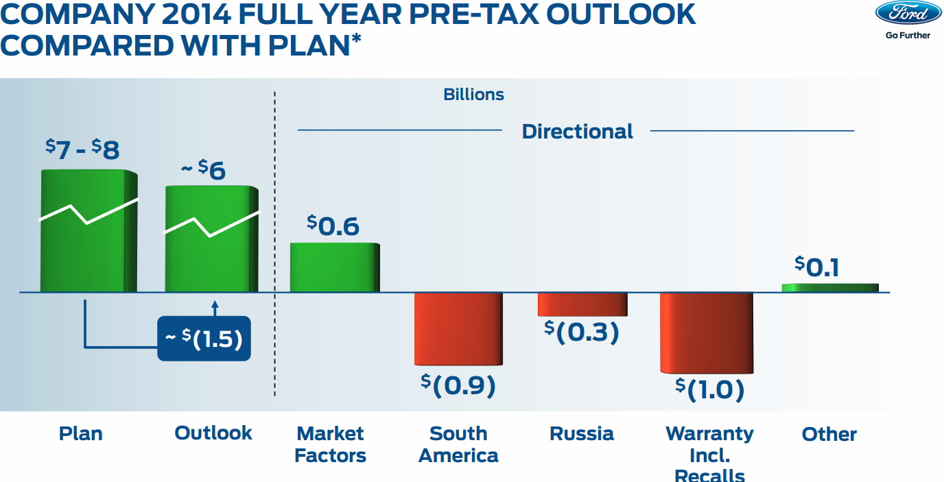 On top of Europe and South America operations turning out to be worse than anticipated, Ford's warranty costs also ballooned more than expected. All in all, with updated guidance on those key factors, Ford's 2014 pre-tax profit estimates are going to be substantially lower than anticipated at the beginning of this year.