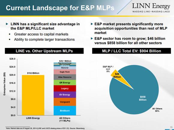Owning a big chunk of LINN Energy is a big advantage because LINN Energy is by far the largest upstream MLP in the sector, as the following slide shows.