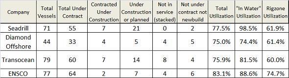 Like just about every metric out there, using the proper context is critical. For example, Rigzone includes ships under construction but not yet deployed, which can skew the numbers, especially if the ship is more than one year from entering service. However, it's common practice for offshore drillers to issue regular fleet status reports that are publicly available. Here is how some of the industry leaders, including Seadrill Ltd (SDRL +0.00%), Transocean (RIG +0.65%), Ensco Plc (ESV +0.00%), and Diamond Offshore Drilling (DO +0.00%) stack up: