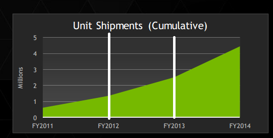 Further along in NVIDIA's analyst day automotive business presentation, the company suggested that it sold approximately 4.5 million chips into the automotive market cumulatively through fiscal 2014. A look at the chart indicates NVIDIA sold about 2 million automotive-focused units during fiscal 2014.