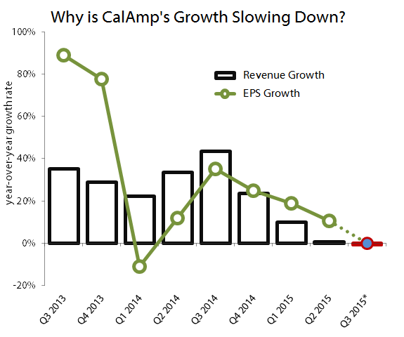 After several years of rapid top-line growth, it appears that CalAmp hit a wall going into the 2015 fiscal year that it may not fully climb past until the 2016 fiscal year begins. The midpoint of its third-quarter guidance projects a slight decline in revenue from the year-ago quarter, which is a bit concerning in light of the fact that CalAmp's top line barely grew at all in this quarter.