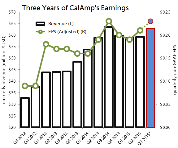 * Q3 2015 (in blue) shows the midpoint of CalAmp's guidance for that quarter.