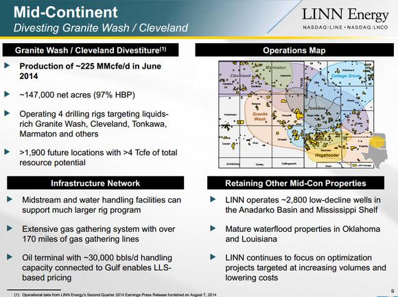 In its Mid-Continent deal, LINN Energy is selling about 145,000 net acres and 195 million cubic feet equivalent per day, or MMcfe/d, of current production. That's basically the company's entire position, though it is slightly less than what LINN Energy planned to sell when it announced its intent to unload the assets to pay for its deal with Devon Energy (NYSE: DVN). At that time, the company planned to sell 147,000 net acres and 225 MMcfe/d, as noted on the following slide.