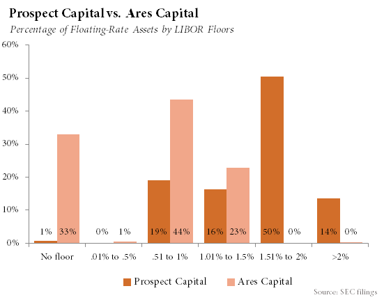 There is a very clear difference in rate exposure for Prospect Capital and Ares Capital. Virtually all of Ares' floating-rate loans have floors of 1.5% or less. And more than three-fourths of its loans will begin to pay bigger yields when LIBOR moves above 1%.