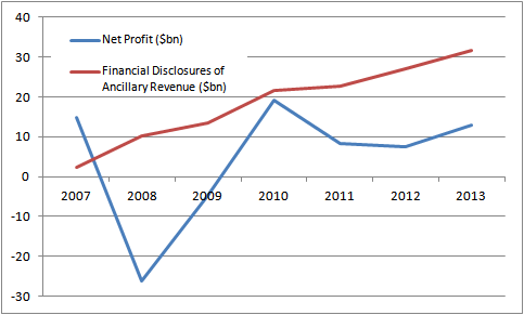 To put these figures into further context, the IATA forecasts that net profit per passenger will be $5.65 in 2014, while industrywide ancillary revenue per passenger (from the data charted here) was forecast to be $16 in 2013. It's fair to say that without ancillary revenue, a lot of airlines wouldn't be profitable.