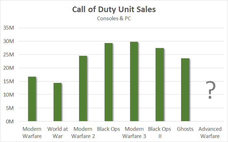 The Call of Duty games released in 2012 and 2013 both sold fewer copies compared with the previous year, with Ghosts posting the lowest sales numbers for the franchise since 2008. The next iteration of the series, Advanced Warfare, is set to be released this November, and while it will probably be one of the best-selling games of the year, preorders for the game are reportedly tracking 50% behind Ghosts.