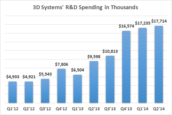 What's more, 3D Systems has been investing heavily in research and development and strategic partnerships. On the R&D front, 3D Systems has more than doubled its R&D expenditures from years past, and management has highlighted that investing in R&D will remain a cornerstone of its strategy going forward. Of 3D Systems' many strategic partnerships, its one with Google may lead to the creation of a game-changing 3D printing manufacturing platform, which could have the potential to make 3D printing a more viable option for larger-scale manufacturing runs.