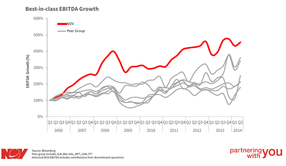 Having this big backlog of orders and being a supplier of consumable products such as drill bits enables the company to keep working and maintain strong revenue and EBITDA growth even through industry downtimes. This has been a major factor in why NOV has consistently outpaced its peers in EBITDA growth over the past eight years.