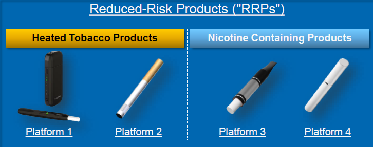 Philip Morris has invested approximately $2 billion to research and develop new products that could become less-harmful cigarette substitutes. The company has four different reduced-risk products, or RRPs, in its pipeline. Two of the products -- called Platform 1 and Platform 2 -- heat tobacco rather than burn it. The other two -- Platform 3 and Platform 4 -- are battery-powered e-cigarette devices that deliver nicotine via an aerosol.