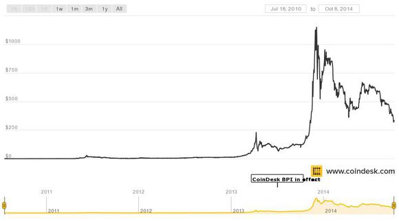 As the chart above shows, the cryptocurrency rose from almost nothing to over $1,000 before crashing down to below $300. Even on a day-to-day level, volatility reigns supreme as in the last week the currency has moved within an approximate 25% range. Bitcoin's rise from near zero has been dramatic, and it's easy to see how increased speculation sent the price of the asset flying, but like most bubbles there is little underpinning the actual value of Bitcoin.