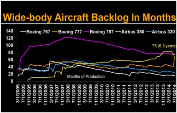 According to Bloomberg analysts, Boeing's and Airbus' wide-body backlogs mainly constitute orders for their new built-from-scratch planes: 787 and A350. The 787 Dreamliner entered service in 2011, and A350 is gearing up to take to the skies later this year. At the end of September, Boeing and Airbus had 861 and 750 orders to fill for the two planes, respectively. Despite the numerous technical snags and delays that both the programs have suffered, airline operators are keen on these planes because of their state-of-the-art technologies -- carbon fiber bodies, new engines, aerodynamic wings, and of course unmatched fuel efficiencies. The 787 promises 20% more fuel efficiency than similar sized planes, while A350 touts 25% fuel cost savings over competing planes.