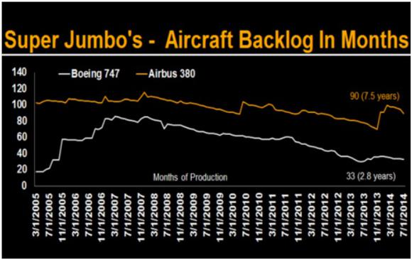 Airbus' superjumbo, the A380, has met a similar fate as demand has dwindled. However, the A380 backlog got a boost at the Dubai air show in 2013 when Emirates ordered 47 planes. Airbus has a total of 175 pending orders for this aircraft.