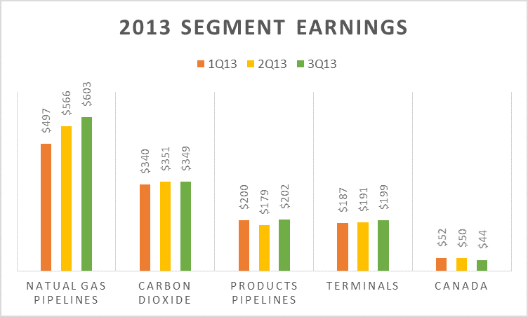 Kinder Morgan Energy Partners currently fuels about 75% of Kinder Morgan's income, so its results are critical to the company. The biggest driver of its business is its natural gas pipeline segment. As we see in the following chart, that segment's earnings are almost double its next largest segment.