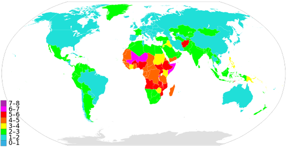 This chart shows the number of children per woman around the world, and it's hard not to notice that the highest fertility rates in the world are in Africa.