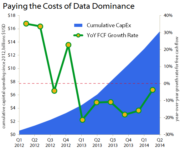 That spending has consequences, of course. Google's free cash flow has declined on a year-over-year basis in each of the past six quarters, and comments in the company's last earnings call indicate that this is likely to continue for the time being.