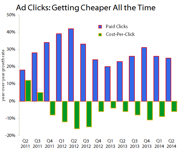 Google's core advertising business -- once again responsible for roughly $0.09 of every $0.10 in revenue the company earns following its Motorola divestment -- has been for almost three years now driven entirely by surging volume. The upcoming third quarter is likely to be Google's 12th consecutive quarter of delivering at least 20% more paid ad clicks while generating less revenue per click: