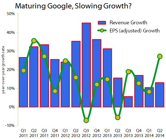 The divergence of paid clicks and costs-per-click has resulted in a slowdown in Google's overall growth rates. Google has been one of the world's greatest growth stories since its formation 16 years ago, but its year-over-year top-line growth hasn't surpassed 20% for five quarters. And save for last quarter's big post-divestment surge in EPS (Motorola had been a drag on earnings), Google's adjusted EPS hasn't grown by more than 20% since the third quarter of 2011 -- you'll notice that this was also the last quarter in which costs-per-click rose alongside paid clicks: