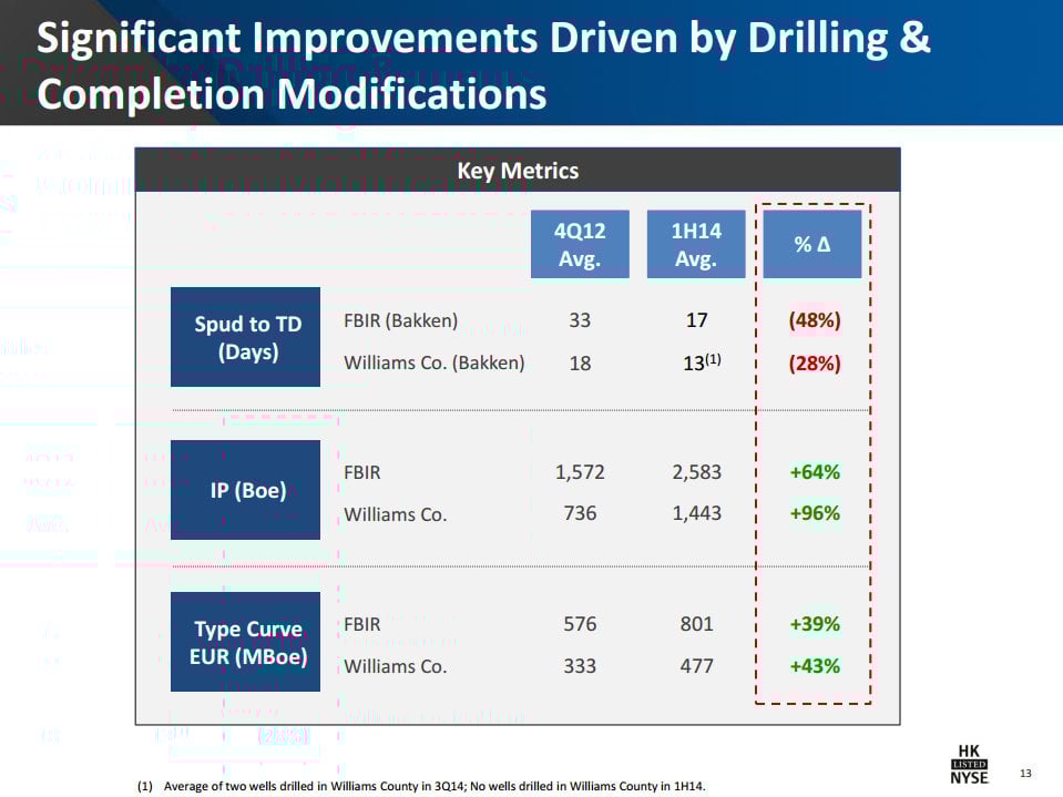 While a lot of penny stocks are shallow shell companies, Halcon Resources Corp (NYSE: HK) is full of oil-rich growth. In fact, its oil production jumped 140% from the first quarter of 2013 to the third quarter of 2014 thanks to its strong position in the Bakken and Eagle Ford Shale plays. Meanwhile, unlike a lot of highly touted penny stocks, Halcon Resources has real assets and as of the end of last year the company had 119.6 million barrels of oil equivalent, or BOE in proved reserves that were worth $2.3 billion. Meanwhile, the underlying business continues to improve. As the following slide shows, the company has dramatically improved its Bakken Shale operations.