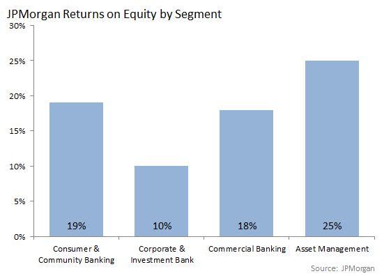 This performance is notable because the weakest unit within the community banking business -- mortgage banking -- is also one of the largest at nearly one-third of its equity base. With the refinance index down 30% from the year-ago period, JPMorgan's spot as the No. 2 mortgage originator isn't contributing to earnings like it did in 2013.