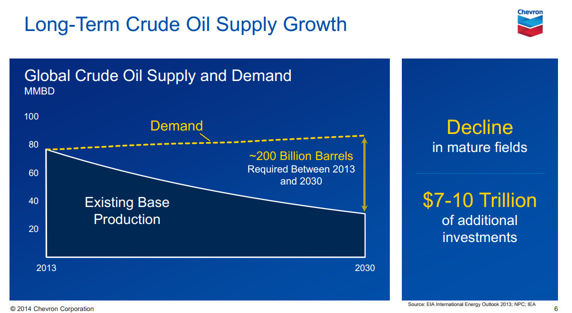 What OPEC is banking on is having fewer competitors when oil supplies start to decline. That will happen naturally due to the nature an oil well. As the following slide from a recent Chevron (CVX 0.45%) investor presentation points out, existing base production is in a steady state of decline so that nearly 200 billion barrels of new production will need to come online by the end of 2030 just to meet demand.