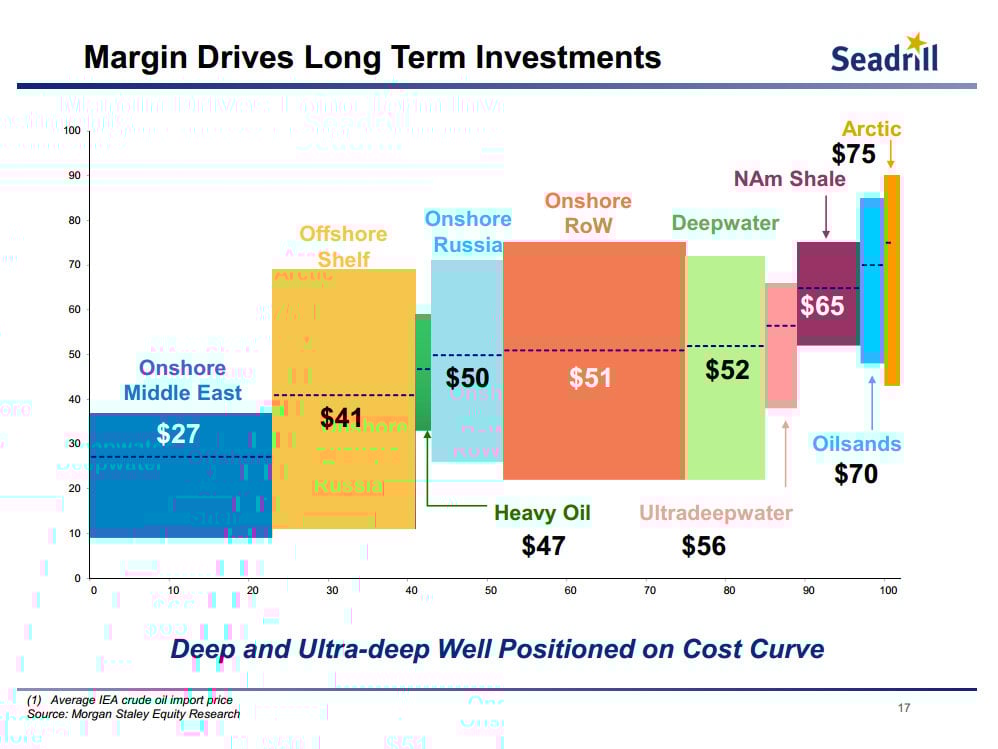The hope is that by allowing oil prices to fall OPEC can force producers elsewhere to cut back on higher cost production. As the following slide from a recent Seadrill (SDRL +0.00%) investor presentation notes, onshore oil in the Middle East costs just $27 per barrel while oil from North American shale and ultra-deepwater sources cost an average of $56 and $65 per barrel, respectively.