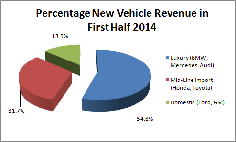 The company plans to start its stand-alone used-car dealerships, called EchoParks, with the opening of a store in Denver. Despite Carmax's leading position in the used-car market, the market remains heavily fragmented, and there is an obvious growth opportunity for larger firms to consolidate the industry. Moreover, used cars already contribute a large part of profits at Sonic Automotive -- and come with higher margins than new-car sales. Here are the revenue and margin figures for the first six months of 2014: