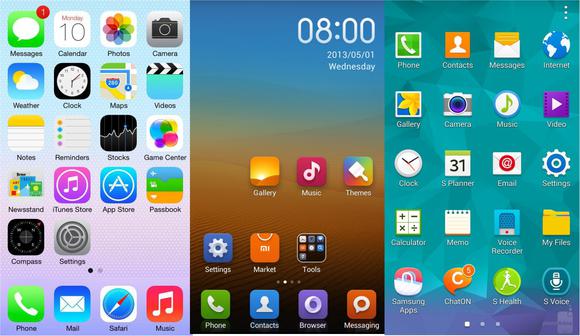 L to R: Apple's iOS, Xiaomi's MIUI, and Samsung's TouchWiz UI.