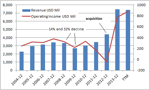 Investing is rarely that simple, of course, and the reality is that Pentair's prospects turn out to be quite cyclical in nature. The following chart demonstrates the significant declines in its revenue and operating income in the last recession. Don't be fooled by the dramatic increases from 2012 onward; that's due to a $5 billion acquisition of the valve and flow control operations of Tyco. (More on that later.)