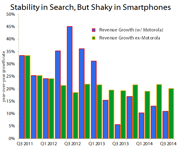 However, 20% growth might seem confusing to anyone who's been calculating Google's growth rates based on Motorola's contributions during the time it was part of the company. Google apparently excludes Motorola revenue entirely from its unaudited financial history -- with Motorola sources included, Google's revenue is only up by roughly 11% over the third quarter of 2011: