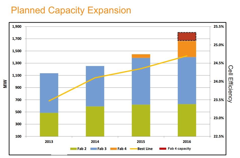 In addition, as this chart shows, SunPower plans on taking advantage of the global boom in solar by expanding production by 57% between 2013 and 2016. It is also continuing to work to increase the efficiency of its solar cells; this is important because superior efficiency can often result in superior long-term cost advantages.