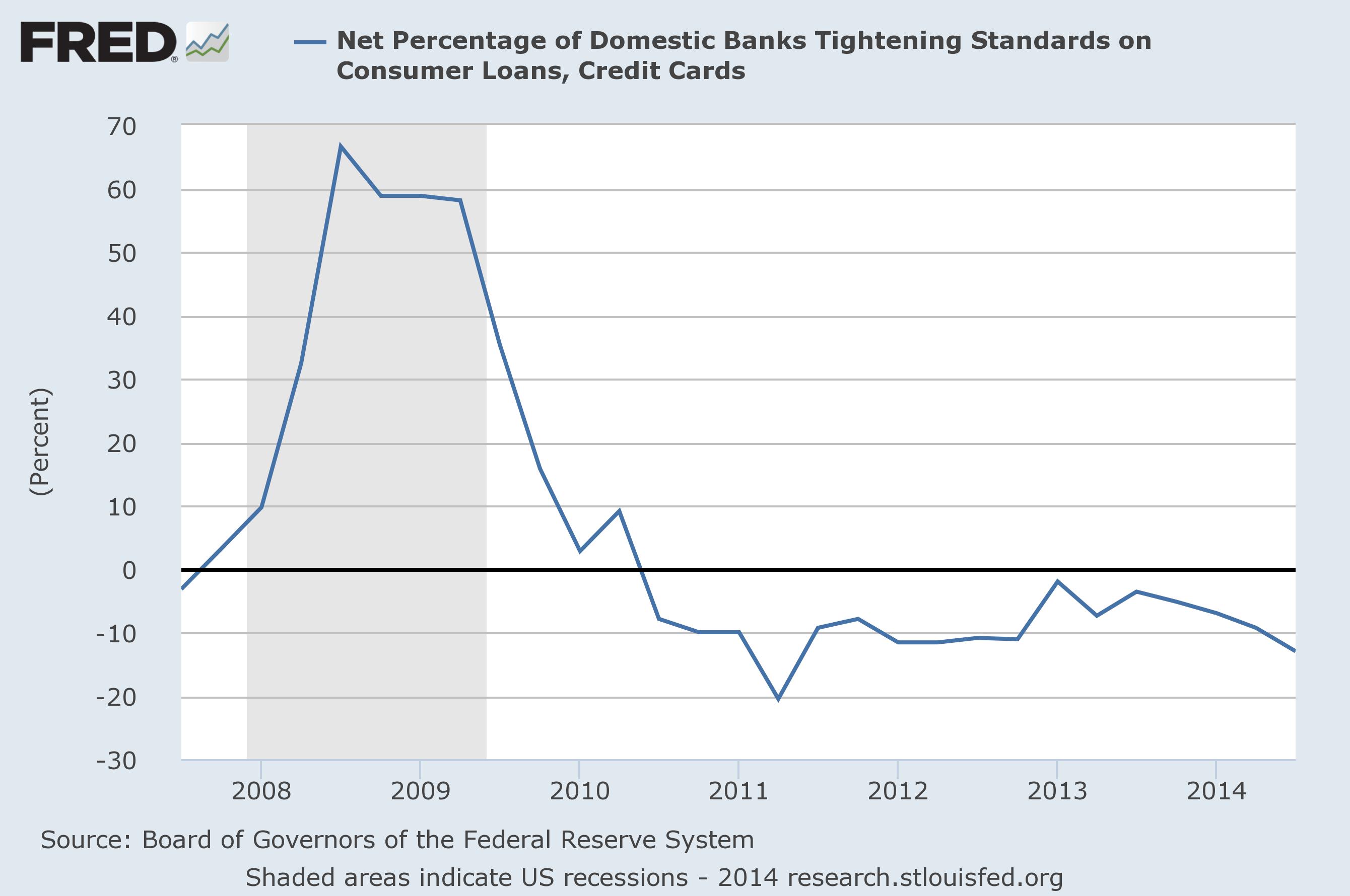 Second, as more and more banks compete for these loans, the consumer has an improved negotiating position. That means better terms and easier approvals. We can measure this by looking at the Federal Reserve's Survey of Senior Loan Officer Survey.