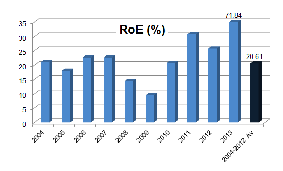 PPG has a strong average ROE, but its earnings tend to go up and down with the economy. Its ROE dipped dramatically during the last recession, because its revenue is heavily dependent on the industrial sector, which tends to be more cyclical than most sectors, and the construction market, which was heavily affected in the last recession.