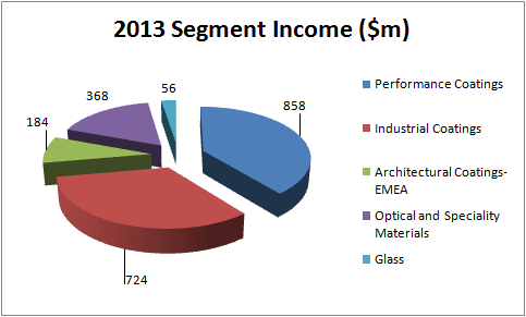 Of the first of the two major segments, the major end markets for performance coatings include aerospace, refinish (automotive and transportation), protective and marine coatings (ships, bridges, and rail cars), and architectural coatings in the Americas and Asia-Pacific region. Meanwhile, industrial coatings sells into the industrial, automotive, and packaging markets. The company has done well with its exposure to strong aerospace and automotive markets, and if construction markets come back, then its architectural coatings business could yet improve in 2014.